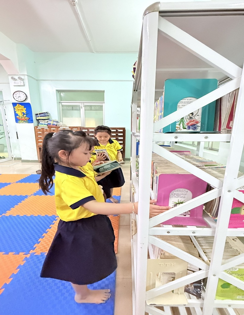 Đến thư viện, các con được tham quan, tiếp cận với các cuốn sách, truyện tranh, và tài liệu học thuật đa dạng. Việc đọc sách không chỉ giúp con phát triển kỹ năng đọc hiểu mà còn khơi gợi sự tò mò, sáng tạo và khám phá.