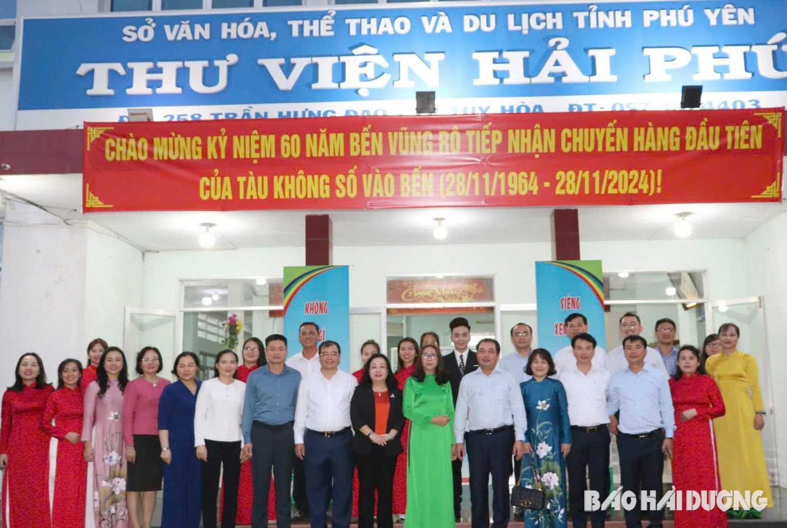 Các đồng chí: Bí thư Tỉnh ủy Hải Dương Trần Đức Thắng, Phó Bí thư Thường trực Tỉnh ủy Phú Yên Cao Thị Hòa An cùng đoàn công tác 2 tỉnh chụp ảnh lưu niệm trước Thư viện Hải Phú