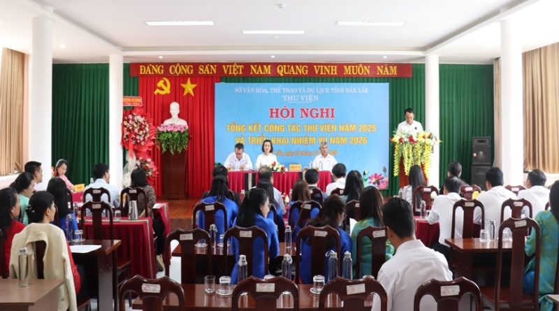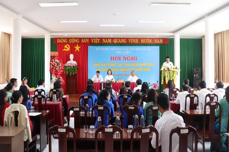 Ngày 24/12/2025, Thư viện tỉnh Đắk Lắk tổ chức Hội nghị tổng kết công tác năm 2025 và triển khai nhiệm vụ năm 2026. Hội nghị diễn ra trong bối cảnh đơn vị có nhiều thay đổi về tổ chức bộ máy, đồng thời phải đối mặt với không ít khó khăn do tác động của thiên tai và yêu cầu đổi mới trong giai đoạn hiện nay. Tuy nhiên, với tinh thần đoàn kết, chủ động và sáng tạo, Thư viện tỉnh đã nỗ lực hoàn thành tốt các nhiệm vụ được giao, tạo nhiều dấu ấn nổi bật trong hoạt động chuyên môn, đặc biệt là trong chuyển đổi số và phục vụ cộng đồng.