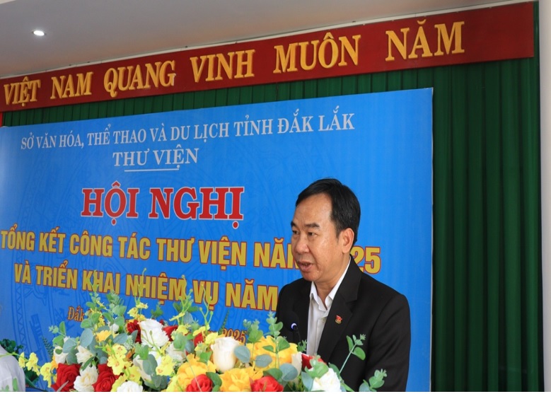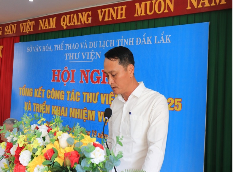 Phát biểu chỉ đạo tại Hội nghị, ông Lê Hoàng Phú – Phó Bí thư Đảng ủy, Phó Giám đốc Sở Văn hóa, Thể thao và Du lịch ghi nhận và đánh giá cao tinh thần đoàn kết, trách nhiệm và những kết quả nổi bật mà tập thể Thư viện tỉnh đã đạt được trong năm 2025; đồng thời định hướng một số nhiệm vụ trọng tâm cần tập trung thực hiện trong năm 2026, trong đó nhấn mạnh việc tiếp tục đổi mới phương thức hoạt động, nâng cao chất lượng phục vụ bạn đọc, đẩy mạnh chuyển đổi số và mở rộng phạm vi phục vụ đến các vùng đặc biệt khó khăn.